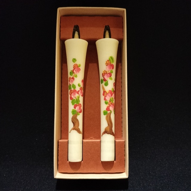 梅 開花時期:1月下旬~5月上旬 手描きの絵蝋燭は、一つ一つが職人の手によって丹念に描かれています。綺麗な花模様や風景が描かれた蝋燭は、仏様にお供えするお花の代わりとして使われてきました。またお参りだけではなく、お部屋のインテリアやリラックス効果も抜群。一日の疲れを癒す癒しアイテムとしてもおすすめです。 絵蝋燭は、冬の雪深い地域で生まれた文化です。冬になるとお花の採れない時期が長くなるり仏様にお供え出来ないのは申し訳ないという思いで生まれました。全て手作業で描かれるこだわりの絵柄は、お客様に幸せな時間をお届けすることを願っています。贈り物としても喜ばれること間違いなし! 心が和む芸術品のような手描き絵蝋燭で、特別な時を演出しませんか。季節や気分に合わせて素敵な絵蝋燭をお楽しみください。 燃焼中は近くに燃えやすいものを置かないようにご注意ください。 サイズ:全長 約10センチ 燃焼時間:約80分 原料:蜜蝋・植物蝋・灯芯